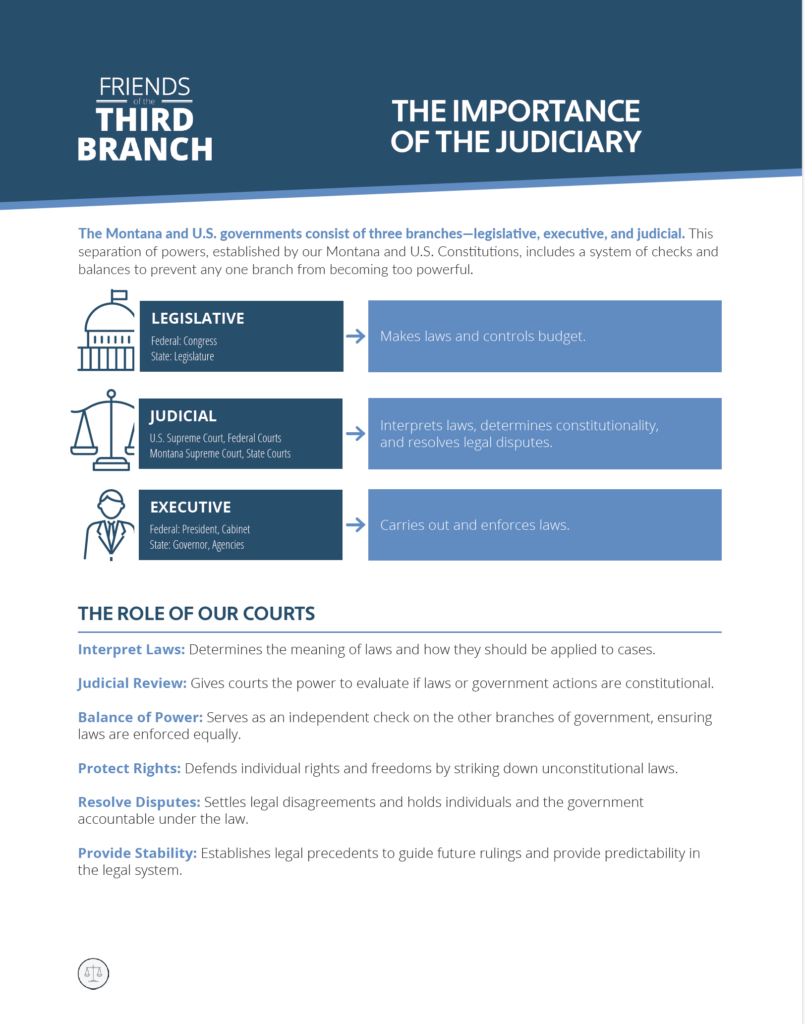 The Montana and U.S. governments consist of three branches—legislative, executive, and judicial. This separation of powers, established by our Montana and U.S. Constitutions, includes a system of checks and balances to prevent any one branch from becoming too powerful.